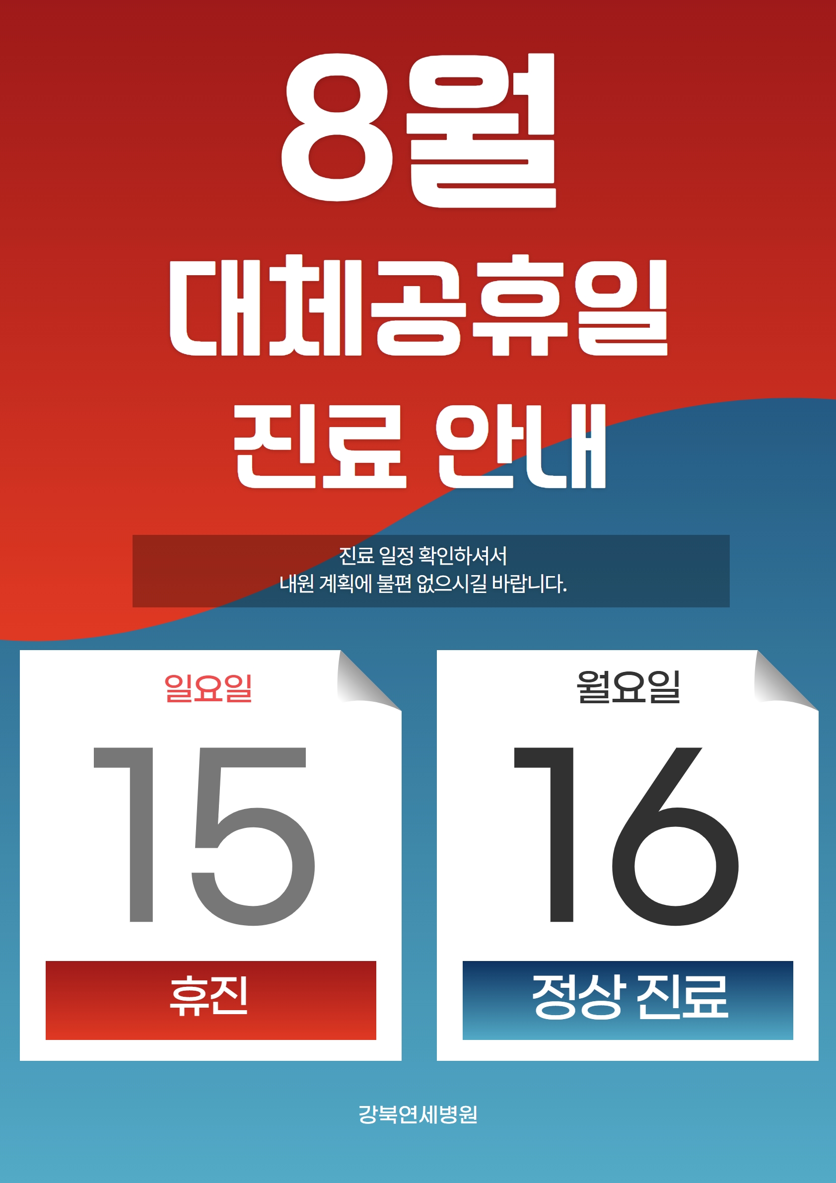 안녕하세요. 강북연세병원입니다. 8월 진료안내 드립니다.